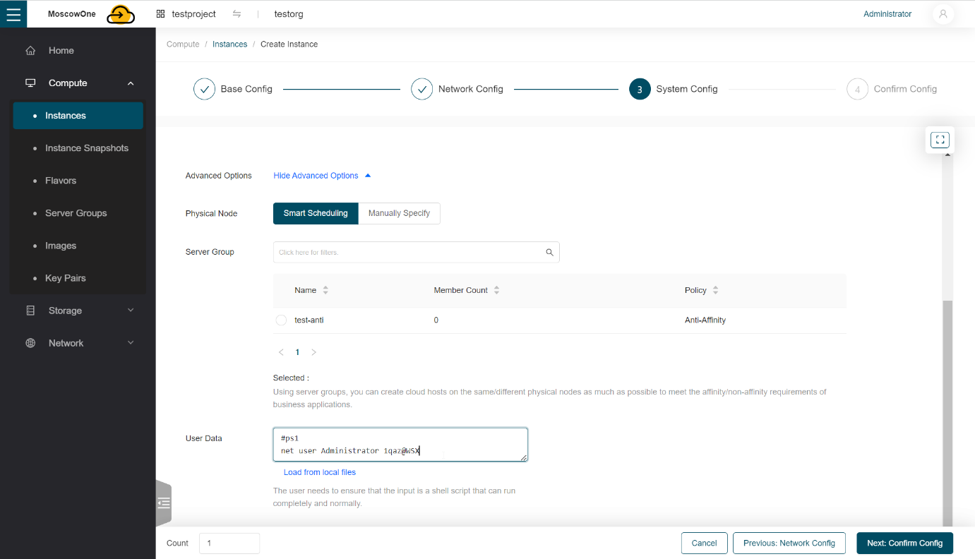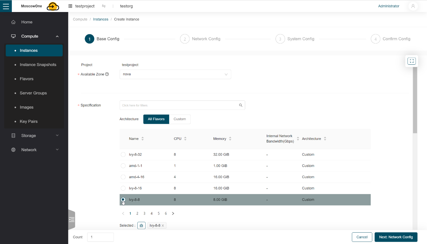 Available Zone оставляем по умолчанию, в поле Specification выбираем конфигурацию виртуальной машины.