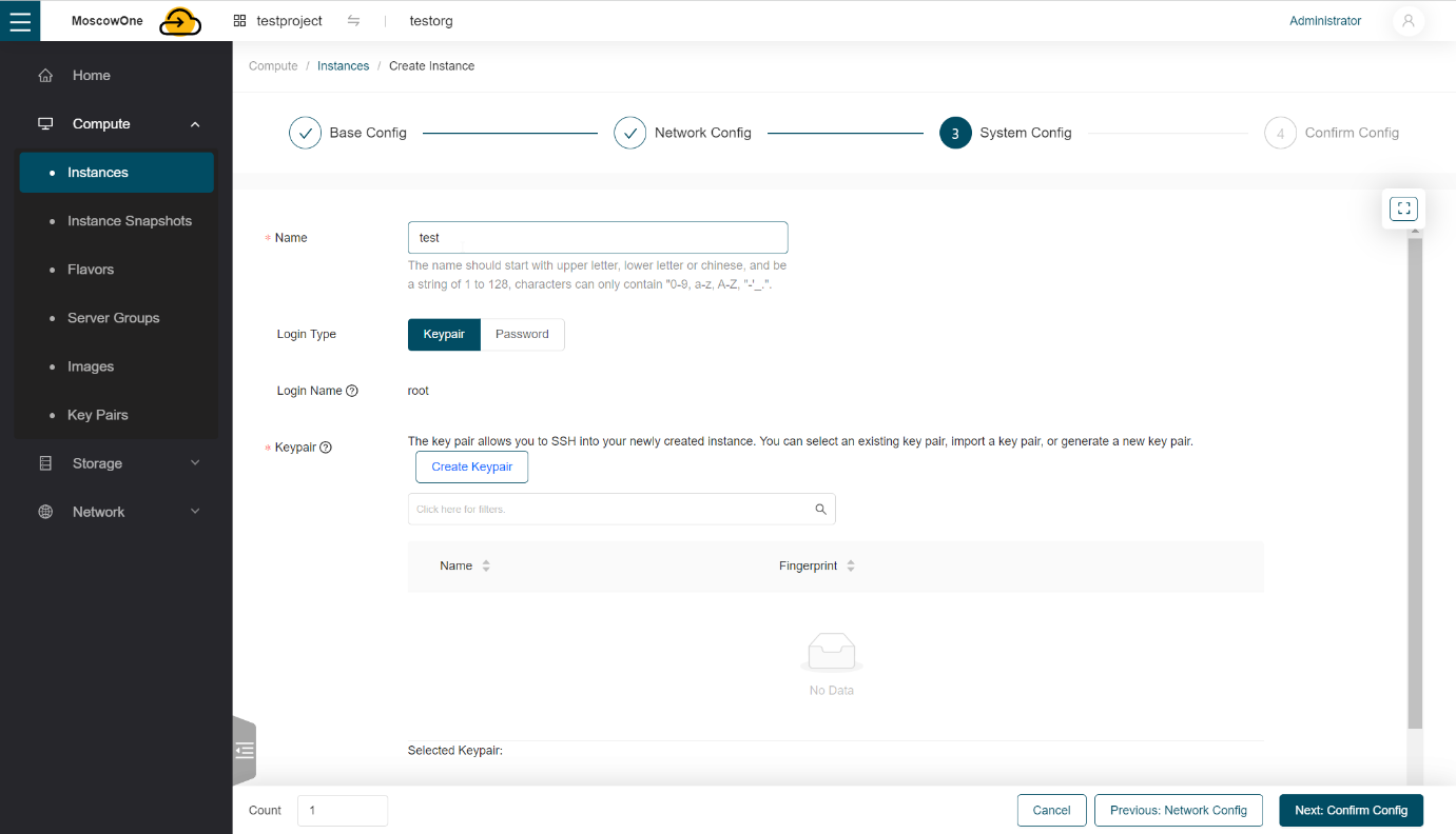 Создать или подгрузить SSH ключ в панель управления виртуальными машинами можно так же заранее, в разделе Compute -> Key Pairs, по такому же алгоритму.