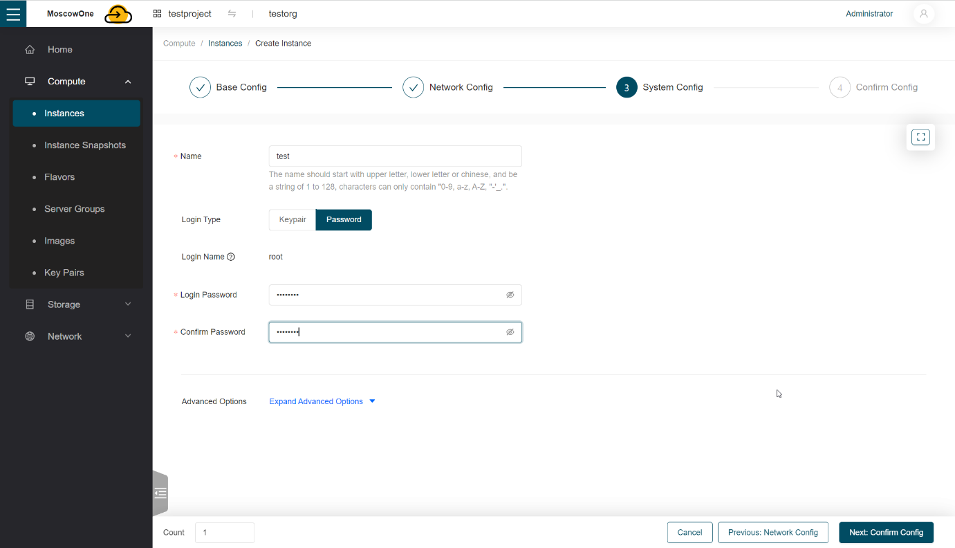 В разделе Login Type выбираем как будет осуществляться доступ к виртуальной машине, по SSH (Keypair) или по паролю (Password)