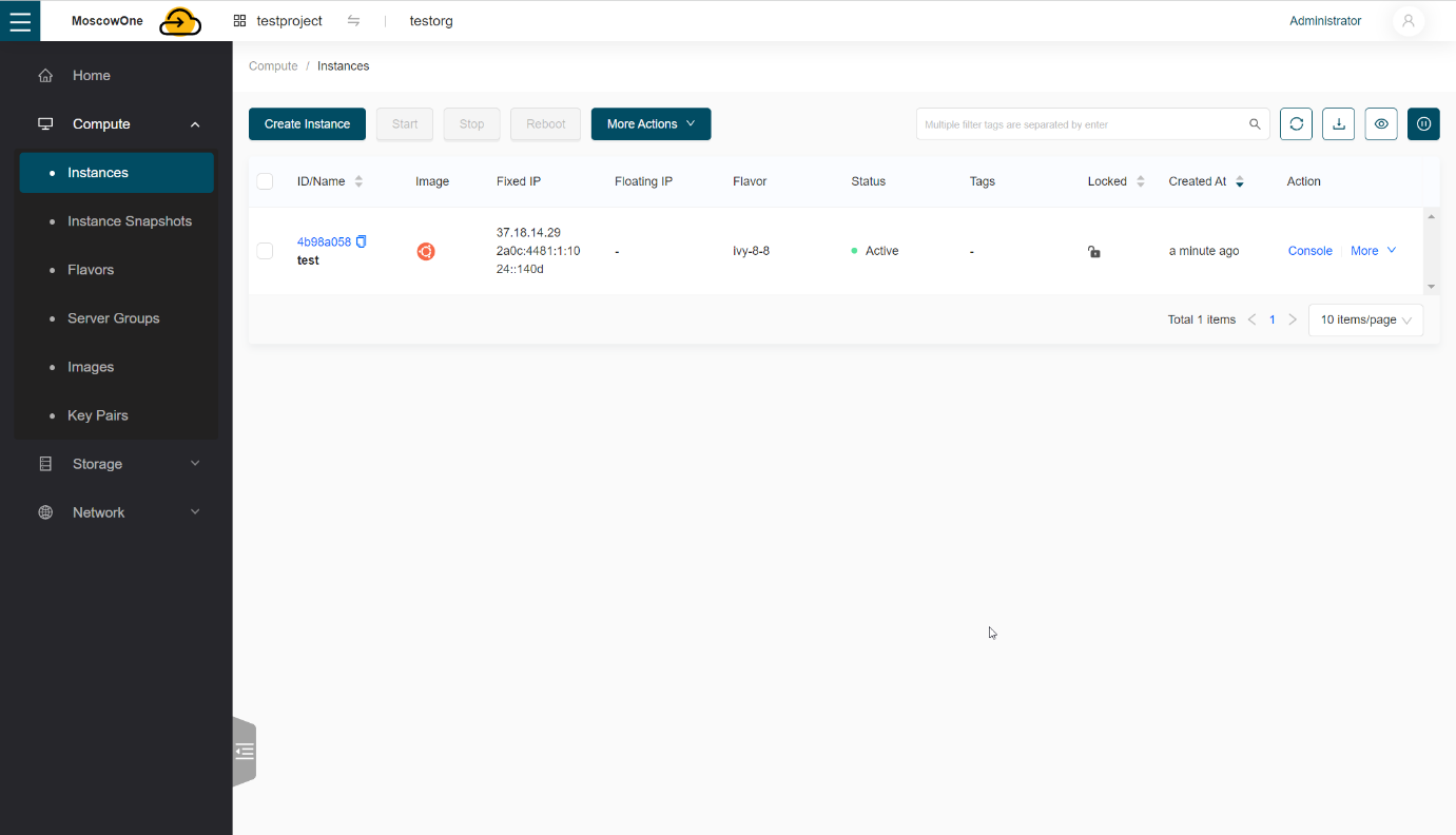После того, как виртуальная машина будет создана, вы сможете увидеть ее в панели на той же вкладке Compute -> Instances.