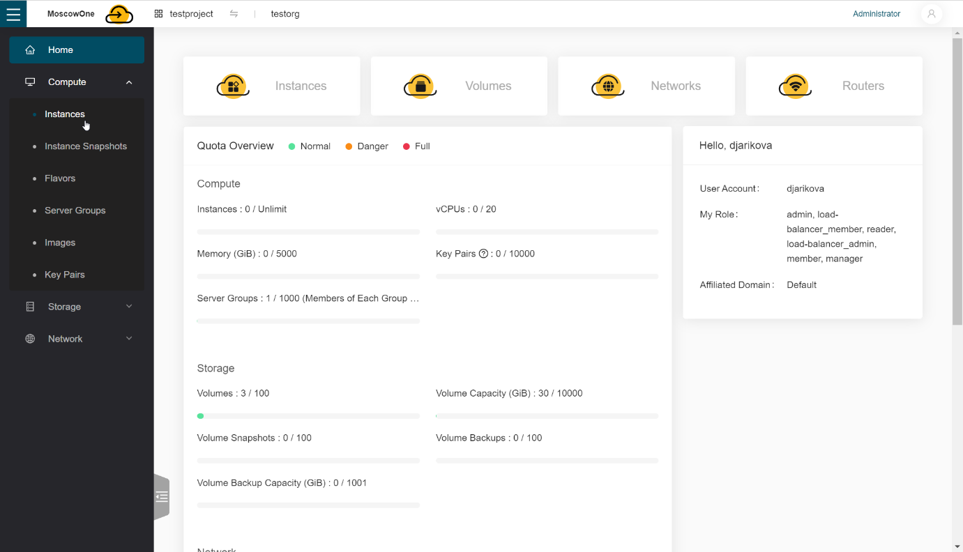 На главной странице в панели отображается количество занятых и доступных в рамках проекта ресурсов в выбранной вами зоне.